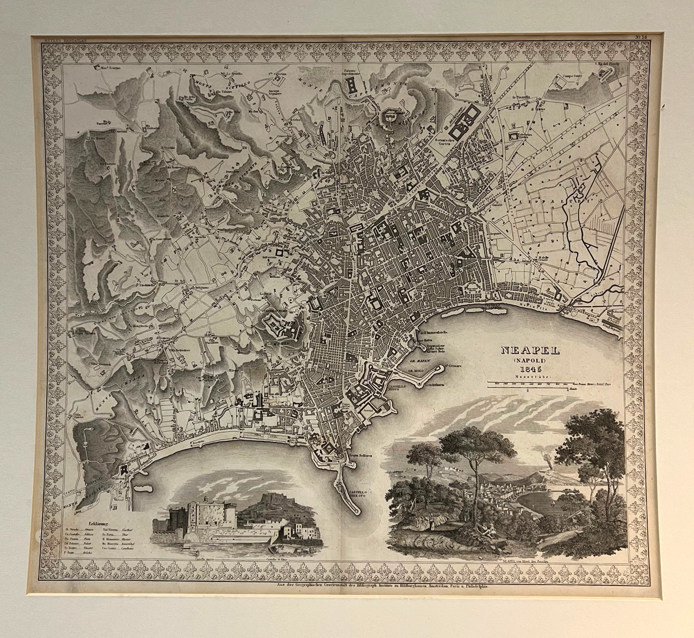 1809-25 Neapel (Napoli) 1845. Espenhost 3.3.1 - Stadplan von N eapel mit 2 Ansichten von "Castello nuovo und Castello St. Elmo" und "Neapel vom Hügel des Pausilipp" mit dem Vesuv im Hintergrund. Aus:J. Meyer's Großem Hand-Atas, Hildburghausen u.a., Bibliogr. Institut. | ||