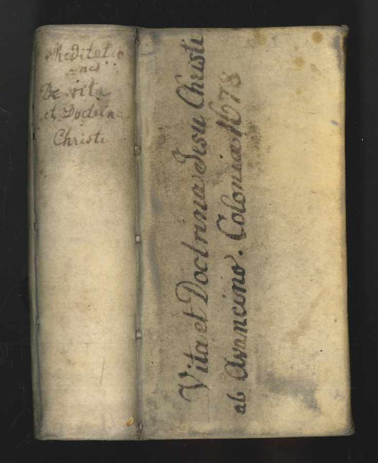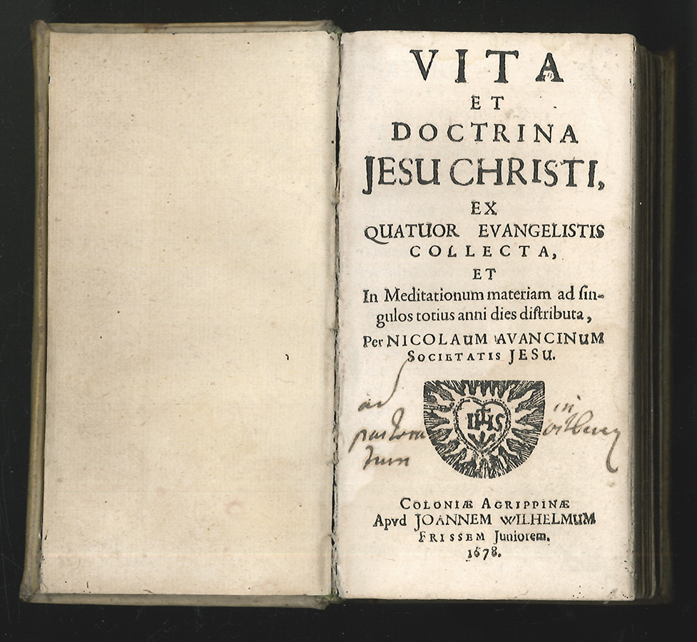 1827-25AVANCINI, Nikolaus von. Vita et doctrina Jesu Christi, ex quatuor Evangelistis collecta [...] Köln, Johann Wilhelm Frissem 1678. 12°. Titel, 17 Bll., 555 S. Pgmt.-Bd. d. Zeit mit handschriftl. Deckel- u. Rückentitel. Berieben, Schnitt fleckig, innen teils etwas schwach gedruckt. Spiegel mit zeitgen. Notiz u. Kaufvermerk der 1960er Jahre. Titel mit zeitgen. Namenszug. De Backer-Sommervogel I, 674, 18; VD 17 12:100525N - In Köln bei Frissem erschienene Ausgabe des beliebten Erbauungsbuches von Nikolaus von Avancini (1611-1686). | |