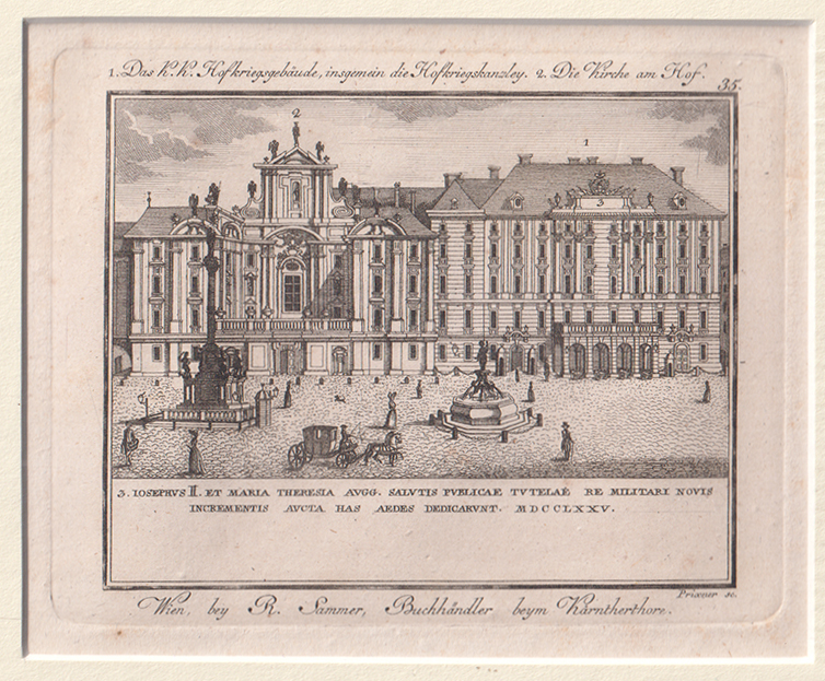1840-25 AM HOF - PRIXNER, Gottfried (1746-1819) sc, 1. Das K.K. Hofkriegsgebäude, insgemein die Hofkriegskanzley. 2. Die Kirche am Hof. Nebehay-W. 588/25 - Aus: Sammer, Rudolf: Wiener Prospekten oder Ansichten der vornehmsten und merkwürdigsten Plätze, Straßen, Palläste, Kirchen, Klöster... in der k.k. Haupt- und Residenz-Stadt Wien. | ||
