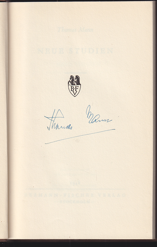 W.-G.² 109 - Mit eigenhänd. Signatur Thomas Manns a. d. Vortitelblatt. Enthält: Deutschland u. die Deutschen. Phantasie über Goethe. Dostojewski - mit Maßen. Nietzsches Philosophie. Joseph u. s. Brüder.