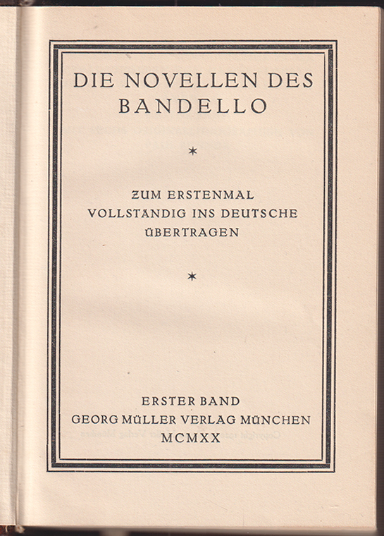 1882-25RENNER - BANDELLO. Die Novellen des Bandello. Zum erstenmal vollständig ins Deutsche übertragen. 3 Bde. München, G. Müller 1920. XXXVIIII, 320 (1); 324 (1), VII, 336 (1) S. Mit 18 lithogr. Taf. v. Paul Renner. OHLdr.-Bde. mit Rückengoldpräg. u. Rückensch. (Perlen älterer romanischer Posa, hrsg. v. Hanns Floerke u. Alb. Wesselski, Bd. XXVII-XXIX) Eines von 800 Expl. | |