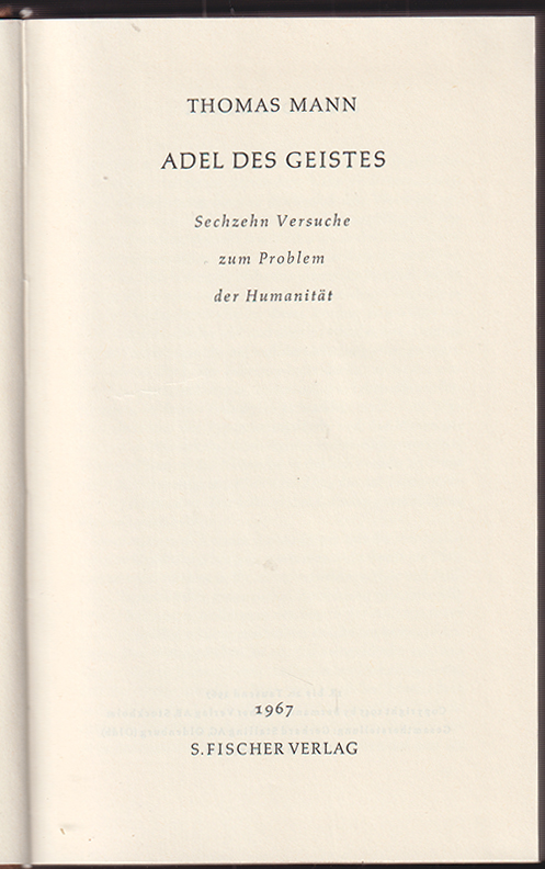 1885-25MANN, Thomas. Adel des Geistes. Sechzehn Versuche zum Problem der Humanität.18.-20. Tsd. o. O. , S. Fischer (1967). 610 S., 3 Bll. OLn. Exlibris.