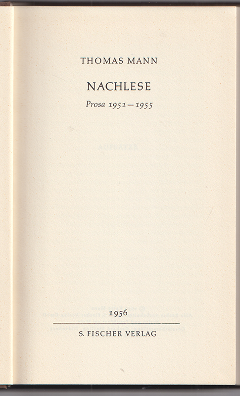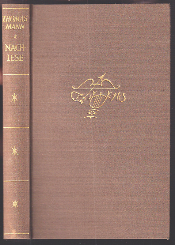 Nachlese. Prosa 1951-1955..(Berlin u. FfM.), S. Fischer 1956. 240 (3) S. OLn. m. Goldpräg. In gutem Zustand. (Stockholmer Gesamtausgabe der Werke von Thomas Mann) EA.