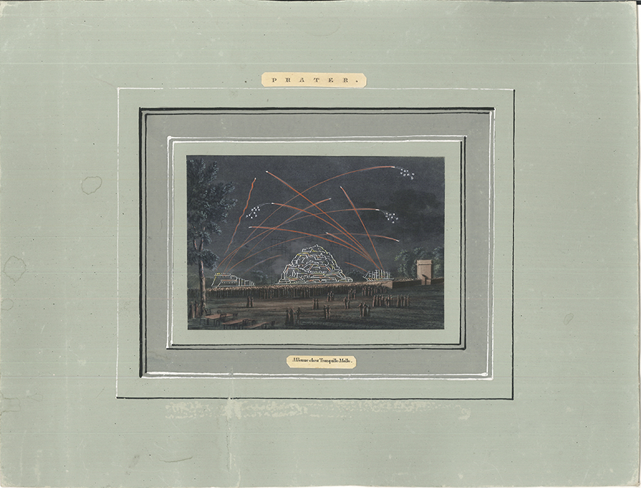 Prater [Der Feuerwerksplatz]. Aquarellierter Kupferstich. Wien, Tranquillo Mollo [1827]. 9 x 13, 4 cm. Auf grünem Trägerkarton.