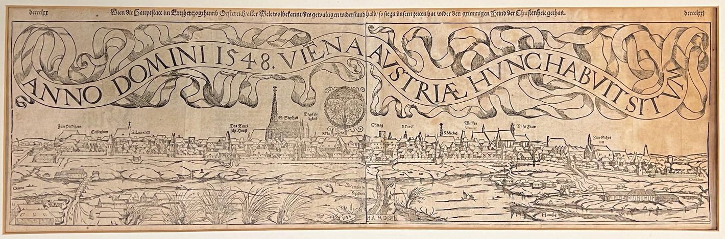 1901-25 WIEN - Wien die hauptstatt im ertzherzogthumb Oesterreich, aller weldt wol bekonnt, des gewaltigen widerstand[s] halb, so sie zu unsern zeiten hat wider den grimmingen feynd der Christenheit gethan. vgl. Nebehay-W. 438, 4 - Frühe Gesamtansicht von Wien mit dem Bandornament "Anno Domini 1548. Vieña Austriae hunc habuit situm". Holzschnitt nach einem Kupferstich von August Hirschvogel. | ||