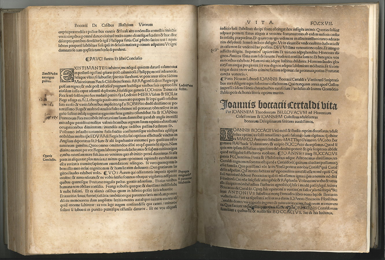 1902-25 BOCCACCIO, Giovanni di - (THEODORICUS/THIERRY, Johannes/Jean). Joannis Boccacii Certaldi de casibus Illustrium virorum Libri Novem quum historiis adfatim cognoscendis tum praeclare instituendis hominum moribus longe utilissimi [...]. vgl. Graesse I, 446 (spätere Aufl.).; British Museum Cat. French Books, p. 71 - Sehr seltene lateinische Pariser Ausgabe von Giovanni Boccacios (1313-1375) Biographien-Sammlung "De casibus illustrium virorum", die er ab der Mitte der 1350er Jahre zusammenstellte. Die vorliegende Ausgabe wurde von Jean Thierry herausgegeben. Letztes Blatt mit einer kurzen Vita Boccaccios. | ||||||