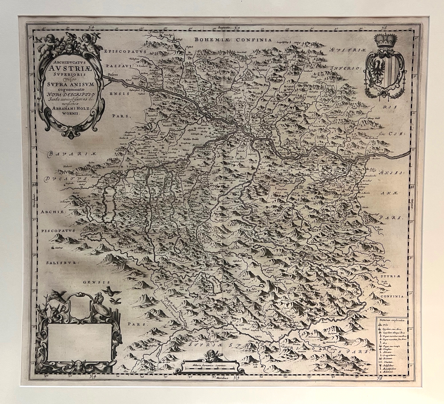 1913-25 HOLZWURM/HOLTZWURM, Abraham (u. Israel). Archiducatus Austriae Superioris vulgo Supra Anisum [...]. vgl. Dörflinger, Österr. Karten d. 18. Jhd., S. 31 - Ursprünglich von Israel Hol(t)zwurm begonnene und nach seinem Tod 1617 von seinem Bruder Abraham fertiggestellte Karte, die das Gebiet von Passau bis Radstadt und von Leopoldschlag bis Trieben zeigt. Die Karte wurde für Joan Blaeus "Atlas maior" verwendet, das vorliegende Exemplar stammt aus der sehr seltenen spanischen Ausgabe. Verso mit spanischem Text. | ||