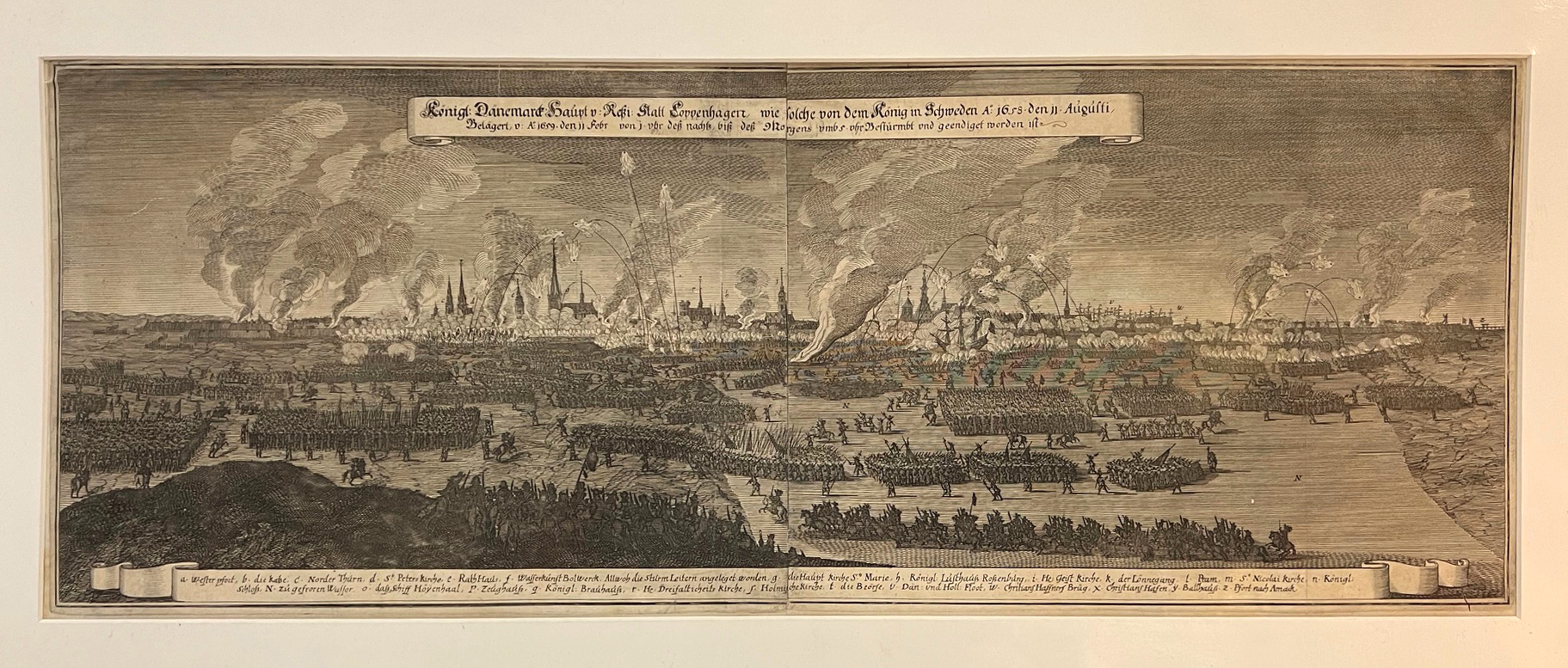 1946-25 KOPENHAGEN - Königl. Dänemarck. Haupt u. Reßi. Statt Coppenhagen, wie solche von dem König in Schweden Ao. 1658. den 11 Augusti, Belägert, u. Ao. 1659. den 11. Febr. von 1 Uhr deß nachtz, biß des Morgens umb 5 uhr Bestürmbt und geendiget worden ist. Ansicht der Kampfhandlungen und Belagerung Kopenhagens durch die schwedische Armee 1658. Am unteren Rand mit Banderole mit Legende der dargestellten Kirchen und Gebäude. Aus Merians "Theatrum Europaeum", Bd. VIII. | ||