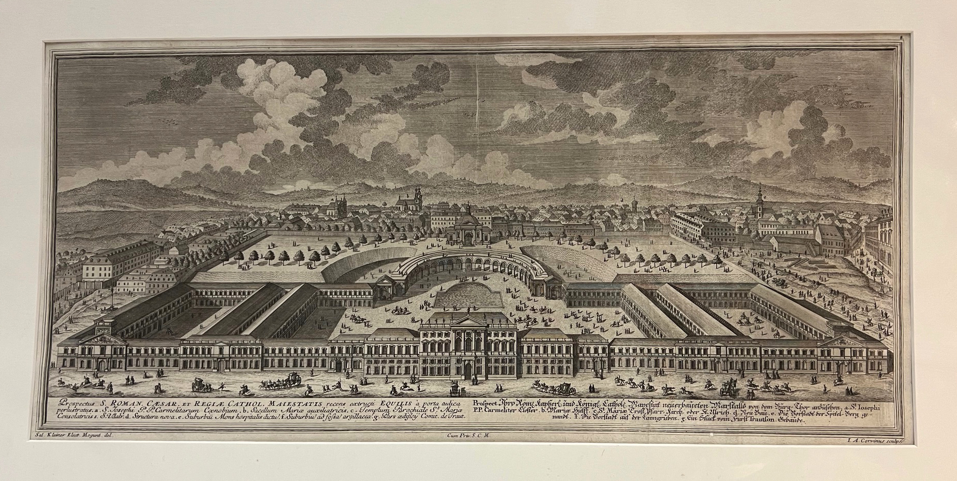 1947-25 MUSEUMSQUARTIER - KLEINER, Sal[omon]. - CORVINIUS, J[ohann] A[ugust] Prospect Ihro Röm. Kayserl: und Königl: Cathol. Mayestät neuerbauten Marstalls, von dem Burg-Thor anzusehen. a. St.Josephi P.P. Carmeliter Closter. b. Mariae Hülff. c. St. Mariae Trost Pfarr-Kirch oder St. Ulrich. d. Neu Bau. [...]. Nebehay-W. 306, II, 8 - Ansicht des heutigen Museumsquartiert aus der Vogelperspektive mit Blick in den heutigen 6. und 7. Wiener Gemeindebezirk. Aus: Salomon Kleiner, Wahrhafte und genaue Abbildung aller Kirchen, Klöster [...]. | ||