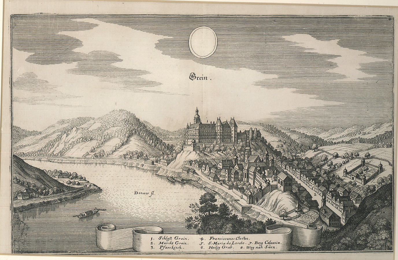 Nebehay-W. 407, 13 - Ansicht von Grein an der Donau. Aus: Topographia Provinciarum Austriacarum. Beschreibung und Abbildung der fürnembsten Stätt und Plätz in den Österreichischen Landen.
