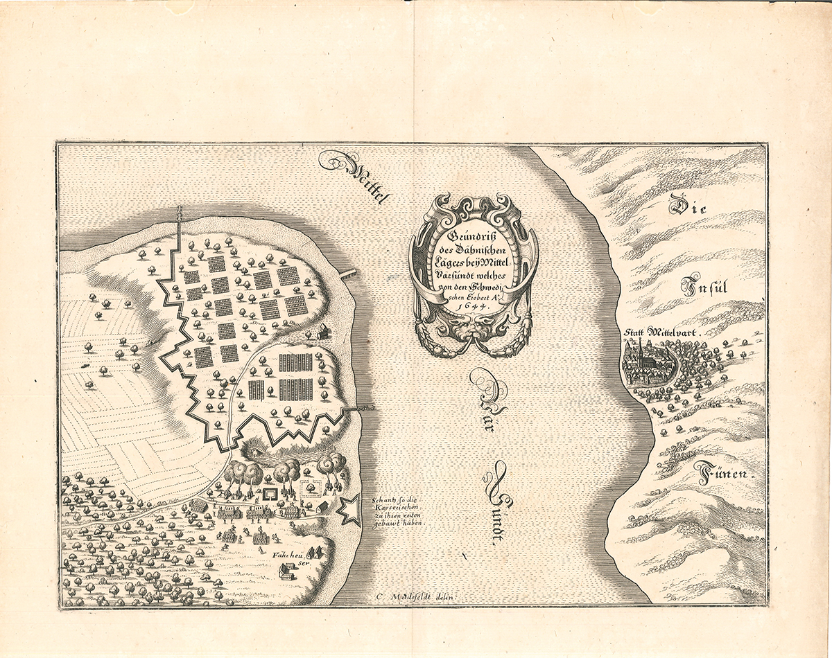 1963-03MIDDELFART - Grundriß des Dähnischen Lagers bey Mittelvarsundt welches von den Schwedischen Erobert A° 1644.Kupferstich. [ca. 1645]. 21,5 x 31,5 cm (Bildauschnitt). Bugfalte. Schlachtplan aus dem Dreißigjährigem Krieg mit Ansicht von Middelfart (Dänemark).