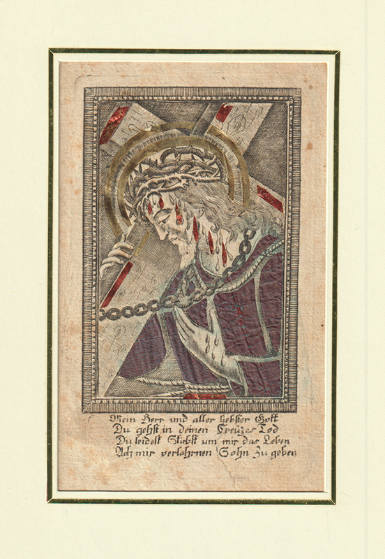 2728-21 KREUZTRAGUNG - Mein Herr und aller liebster Gott, Du gehst in deinen Creuzes Tod, Du leidest Stirbst um mir das Leben, Ach mir verlohrenen Sohn zu geben. Dargestellt ist die Kreuztragung, das Gewand Christi ist mit Stoff hinterlegt, einige Blutstropfen, der Heiligenschein und Teile des Kreuzes mit Metallfolie. | ||