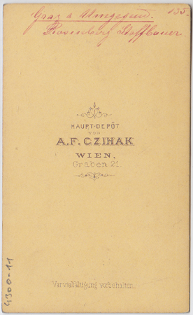 4300-11 GRAZ - Graz u. Umgegend. Rosenberg Stoffbauer. Das Gasthaus Stoffbauer am Rosenberg in Graz. - A. F. Czihak (1840/41-83) betrieb seinen Fotoverlag- und handel seit den 1860er Jahren. Neben Prominentenportraits und Genrefotos, vertrieb der Verlag Stadtansichten von Michael Frankenstein, Stereobilder von den Tiroler Alpen, "Bilder aus dem Wiener Volksleben" und "Wiener Strassenbilder" von Otto Schmidt. (vgl. Starl, Lex. zur Fotografie in Österr., S. 81) | |||