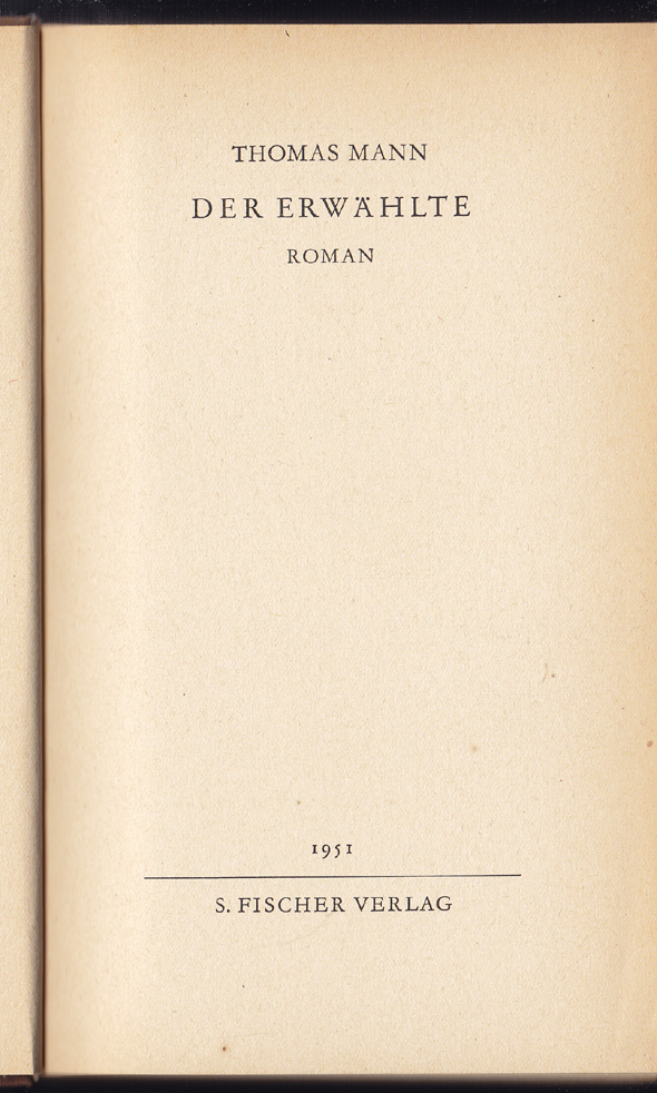 Der Erwählte. Roman. FfM., S. Fischer 1951. 319 (3) S. OLn. Einbd. m. Kratzspur. (Stockholmer Gesamtausgabe der Werke) EA.